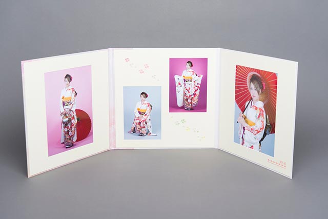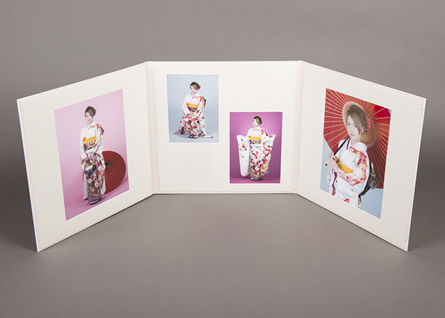 写真六切2ポーズ・2L2ポーズの計4ポーズが収められる当スタジオオリジナルアルバム。高級感のあふれる絹目仕様で、白とピンクの2色から選べます。