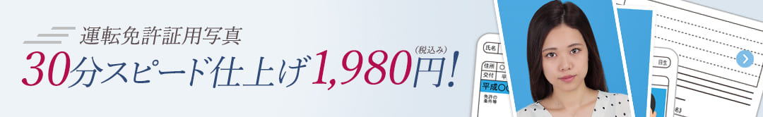 運転免許証 | ¥1,980 | 2.4cm☓3.0cm☓2枚、データなし、他の割引との併用はできません。 |